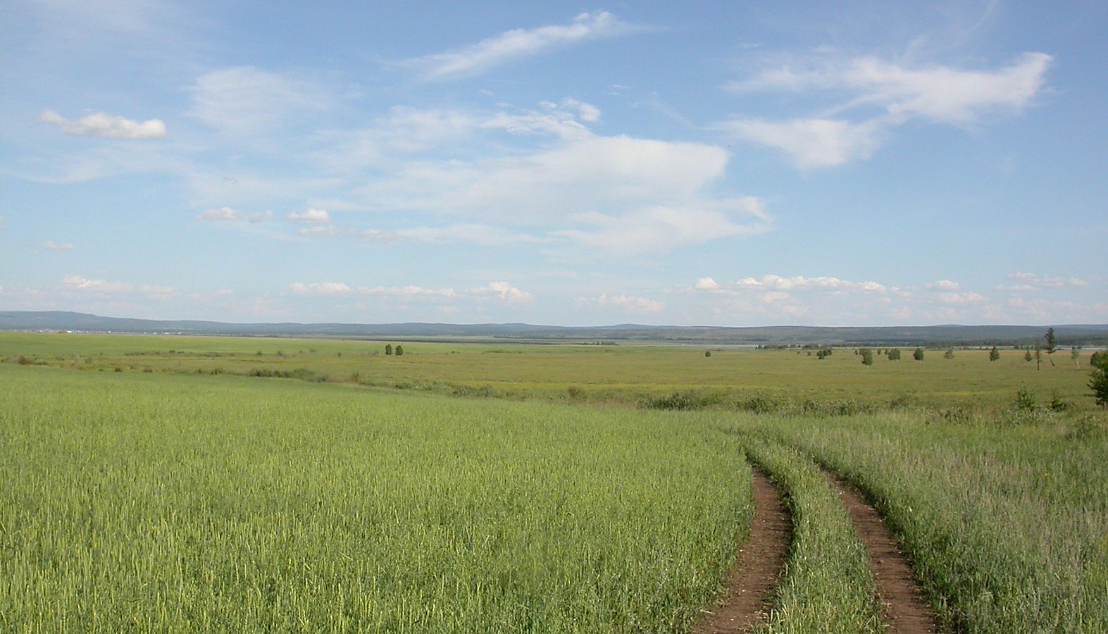Посевы кормовых трав. В отдалении справа — оз. Малый Ундугун, слева — дер. Беклемишево. На заднем плане — Яблоновый хр. 08.08.2006. [summer]