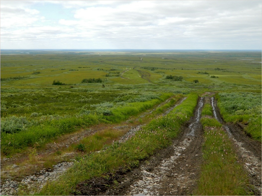 Вездеходная колея идущая от пос. Елецкий к западному склону Полярного Урала (ок. 40 км). Вдали видны небольшие березняки. Июль 2011 г. [summer]