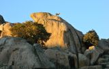 Дубы (Quercus rotundifolia?) на фоне скал в лучах заходящего солнца. На скале — Capra pyrenaica. [winter]