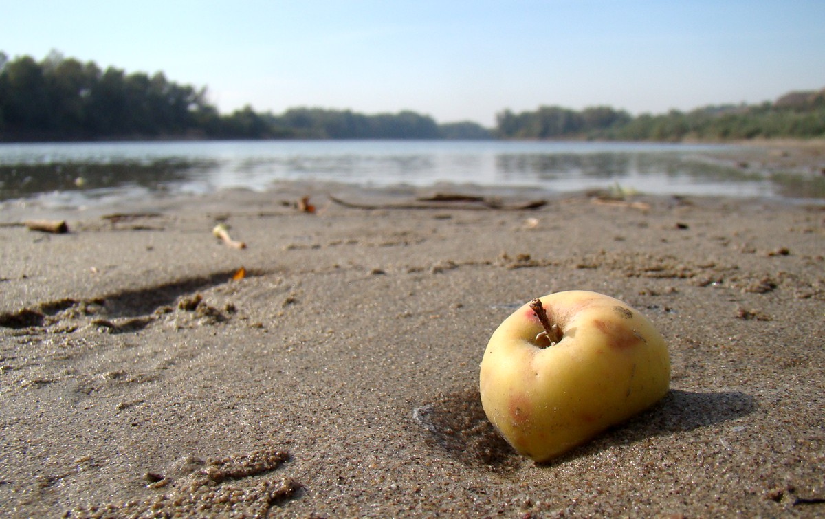 Берег реки Кубань, низкая вода. Вид на старый Хатукайский мост. Над высоким берегом белеет памятник на братской могиле 370 мирных жителей и пионера-героя Муси Пинкензона, расстрелянных фашистскими оккупантами в 1942 году. [autumn]