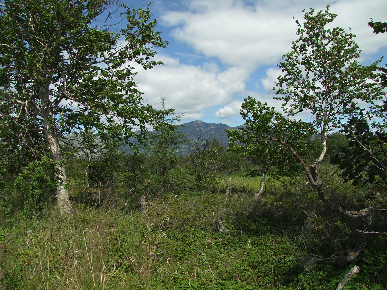 На возвышенной полосе — Betula lanata, Larix cajanderi, Betula middendorffii, в травяном ярусе — Chamaepericlymenum suecicum, Rubus chamaemorus. [summer]