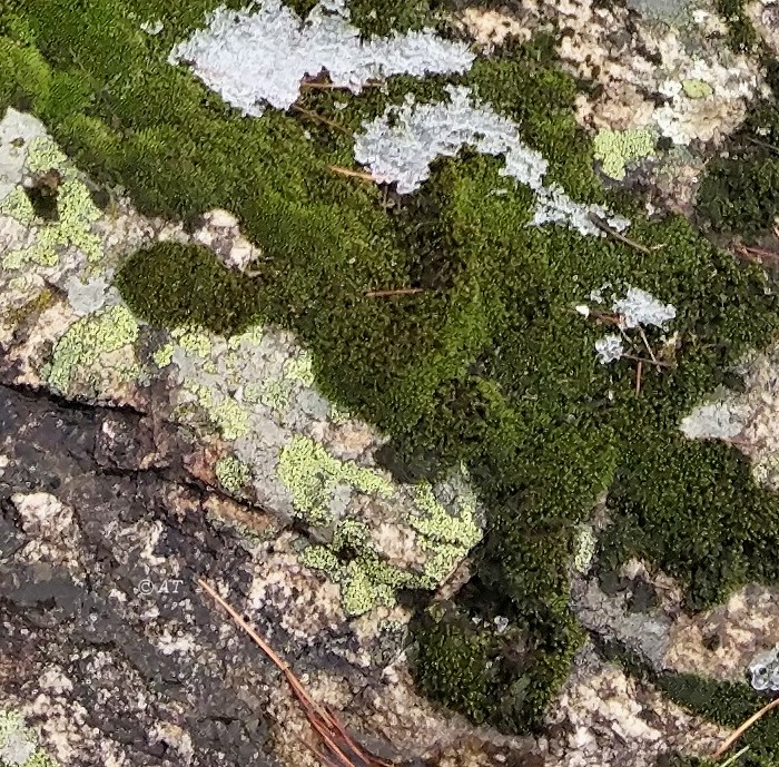 Мох в сообществе лишайников на скальном выходе. [winter]