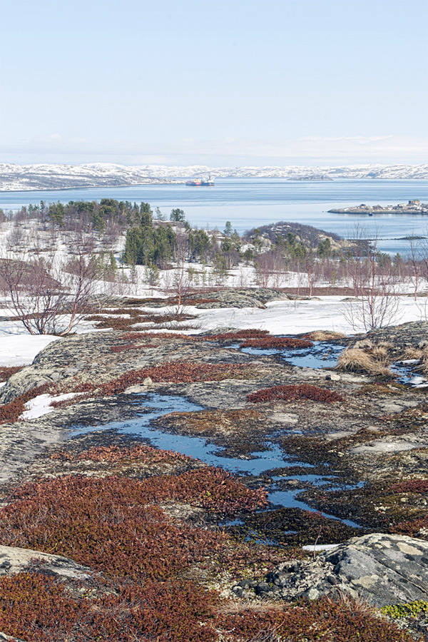 На вершине сопки начинает таять снег, появляются пятна вечнозелёных Empetrum hermaphroditum и Vaccinium vitis-idaea с примесью лишайников. Ярче стала зелень Pinus frieseana. На дальних сопках вдоль Кольского залива снега ещё много. 01.05.2018. [late winter — early spring]