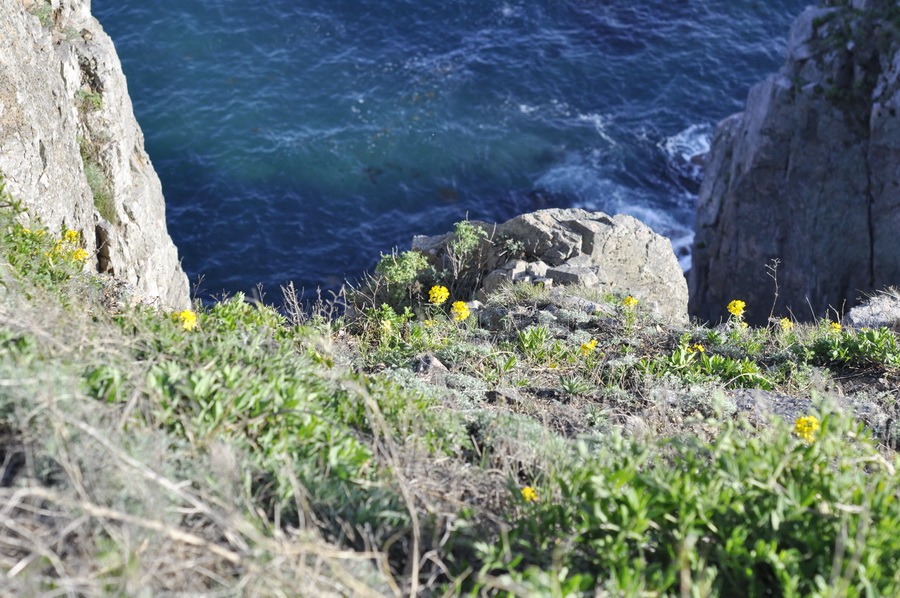 Тропа от м. Маячного идет вдоль скалистого обрыва. Цветут желтым Erysimum amurense и куст Berberis amurensis. 26.05.2019. [spring]