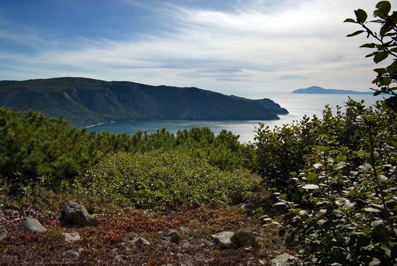 п-ов Старицкого, вид в сторону бухты Светлая. Растительность и ландшафты на п-ове очень разнообразны. На возвышенностях преобладают каменные осыпи с зарослями кедрового стланика, ольхи, карликовой березы, мхов. Встречаются: голубика, брусника, шикша, арктоус, дицентра, филодоце, примула и прочие растения. На заднем плане виден остров Завьялова. 28.08.2010. [late summer — early autumn]