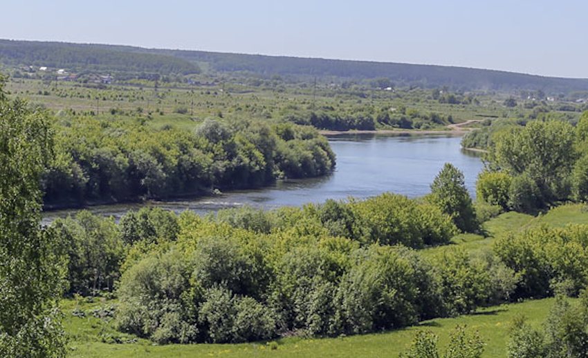 Вид с одной из вершин на долину р. Сылва вниз по течению. Внизу у берега — урёмный лес (Salix, Padus avium, Alnus). Холмы заняты разнотравными лугами и берёзовыми рощами. 05.06.2021. [summer]