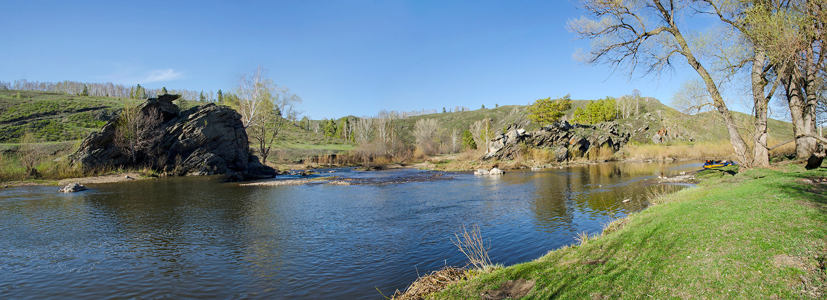 Между двух скал устье правого притока Сакмары — р. Крепостной Зилаир. Вокруг устья вдоль воды растут кусты Salix. Немного дальше одиночные Betula, Pinus и несколько Populus. Выше и на скалах — только Betula и Pinus. 29 апреля 2022 г. [spring]