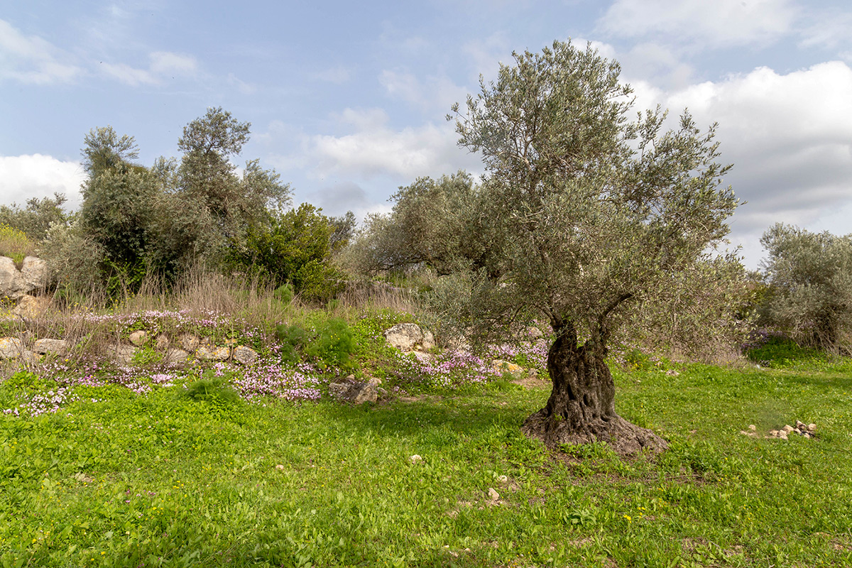На холмистой местности возле монастыря цветут Cyclamen persicum и Calendula arvensis. Справа видна Olea europaea. 19.03.2022. [spring]