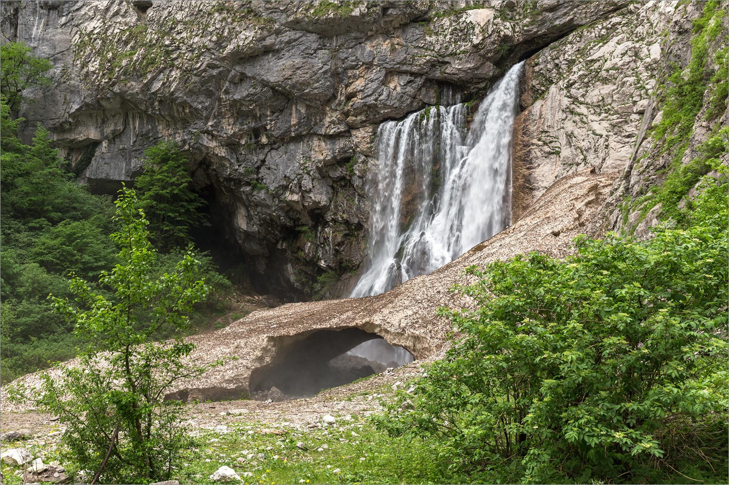 Гегский водопад, падающий с высоты около 70 м; вода в водопаде очень холодная, поэтому снег у подножия скалы обычно лежит до конца лета. На переднем плане слева — груша (Pyrus), справа — цветущая бузина (Sambucus). 17.05.2021. [late spring — early summer]