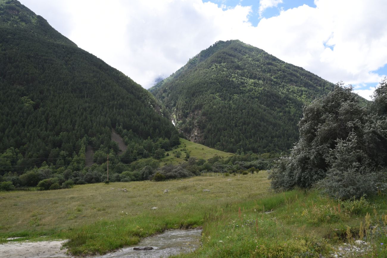Вдали виден конус выноса из троговой долины реки Курмычи. На переднем плане виден канал, отведёный от реки Курмычи. 24 июля 2022 г. [summer]