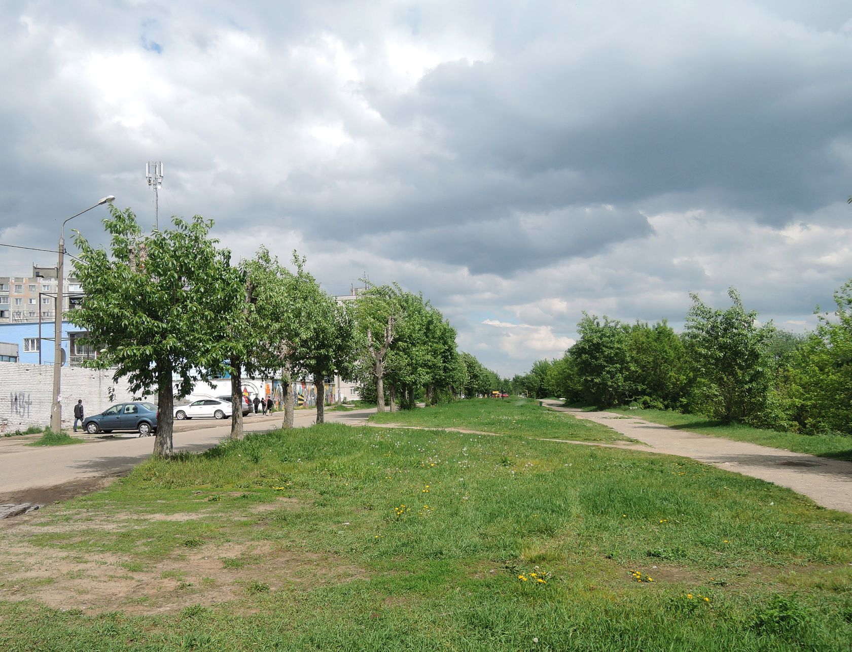 Парковский мкр., ул. Набережная. В озеленении Populus suaveolens, на газонах видны цветущие и плодоносящие Taraxacum officinale. 21.05.2016. [spring]