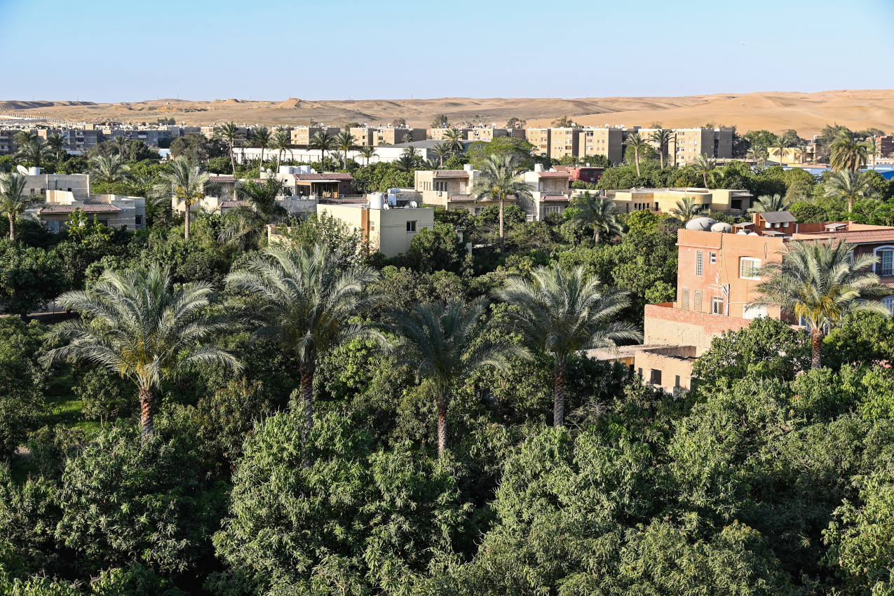 Западная окраина г. Эль-Гиза с посадками Phoenix dactylifera и Ficus у домов. Вдали виден песчаный участок плато Гиза. 29.04.2023. [late spring — early summer]