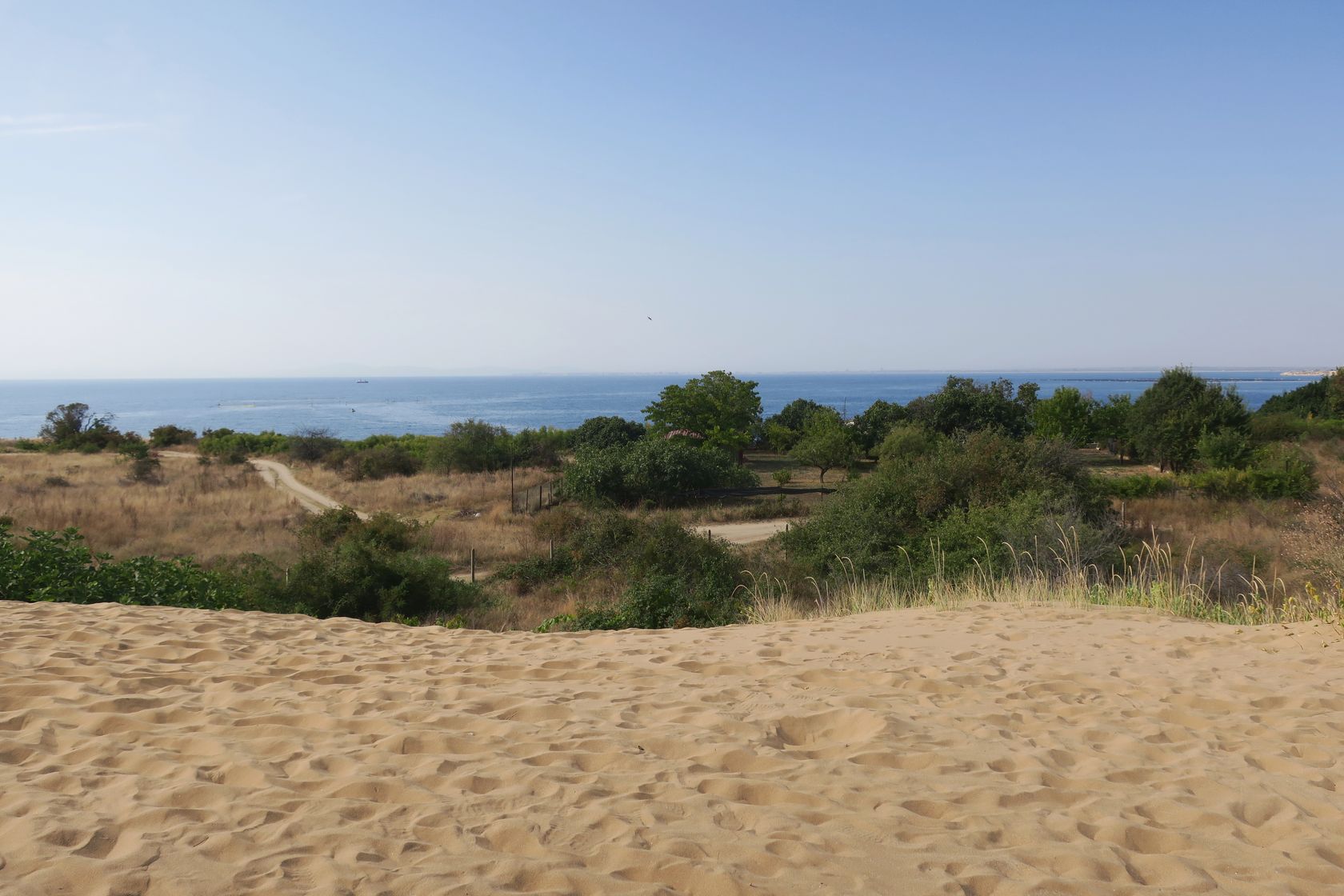 Вид с дюны на западную часть мыса Акротирия и дорогу к оконечности мыса. 15.09.2021. [summer]