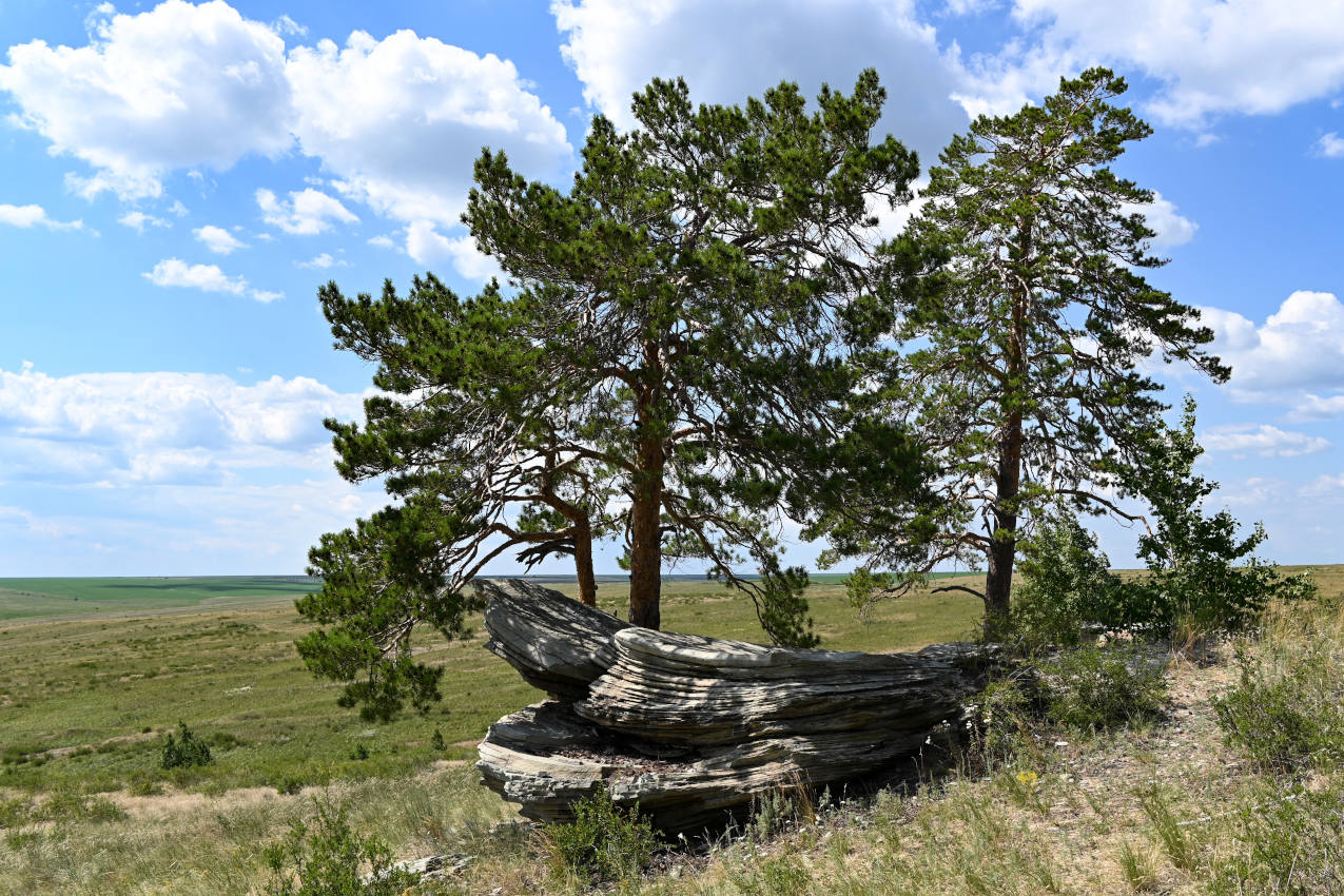 Скала Парус с растущими рядом Pinus sylvestris на вершине лугового склона в северной части Карагай-Губерлинского ущелья. 04.07.2023. [summer]