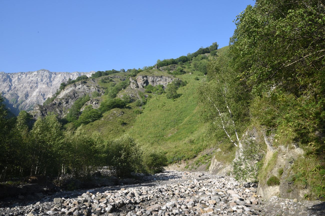 В нижней части долины левого притока по его берегам растут березы. Вдали виднеется стенка горы Дайхох. 10 августа 2023 г. [summer]