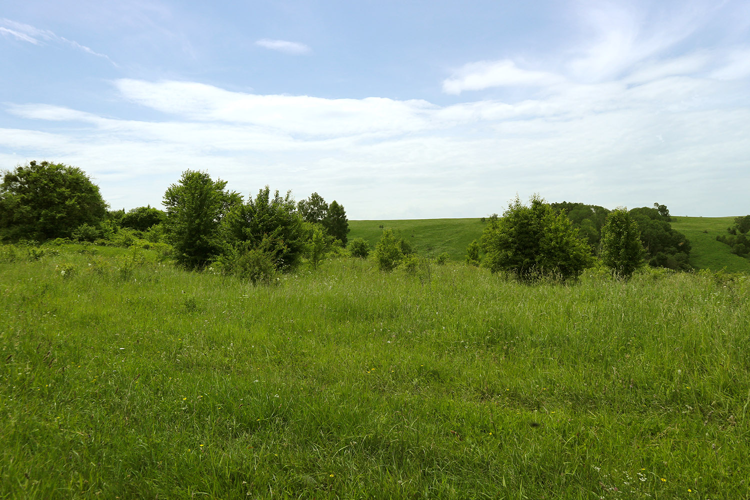За разнотравно-злаковым лугом просматривается очередная балка с ручьём и деревьями. Деревья и кусты на Джиссе встречаются только в обводнённых балках. 15.06.2024. [summer]