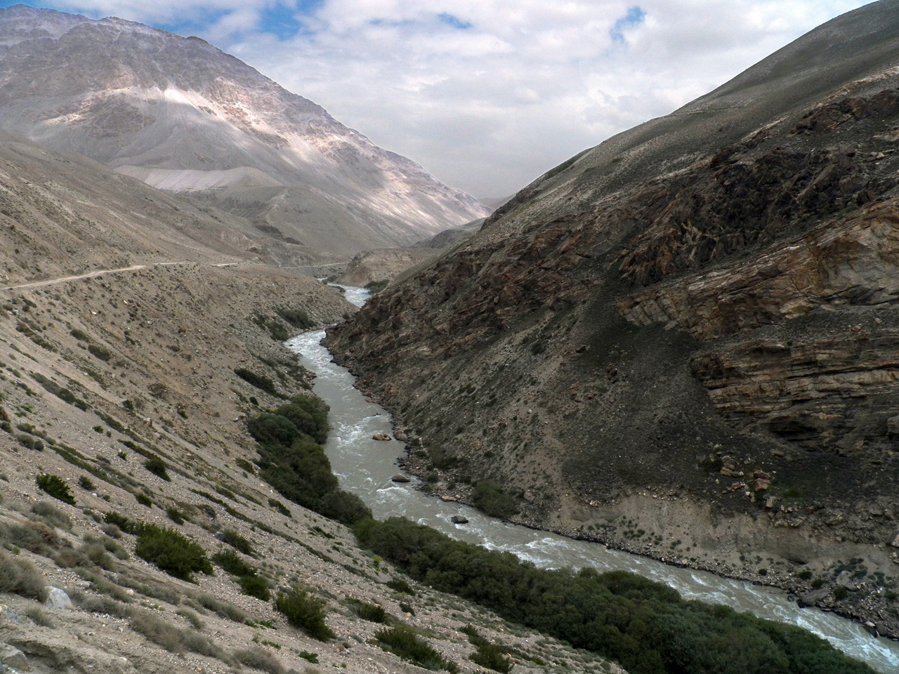 Каменистые склоны каньона и русло р. Памир с узкой полоской невысоких деревьев Salix sp., кустиками Krascheninnikovia ceratoides, цветущими Tetrataenium olgae, Rosa sp.. 3 июля 2024 г. [summer]