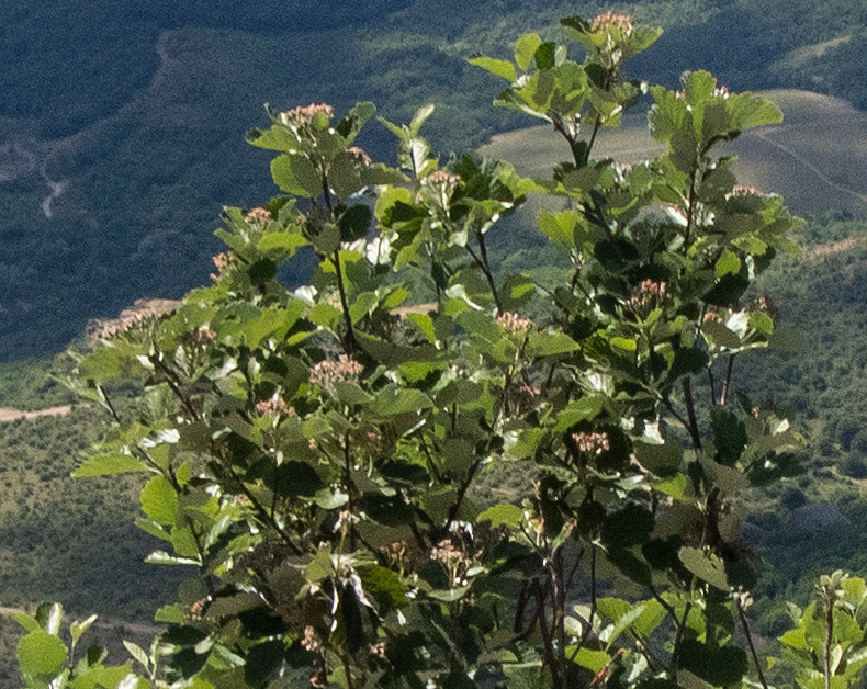 Плодоносящая Sorbus в расщелине на уступе скалы на переднем плане. Вид на Долину Привидений (справа) и Чатыр-Даг (вдали). 03.06.2024. [late spring — early summer]