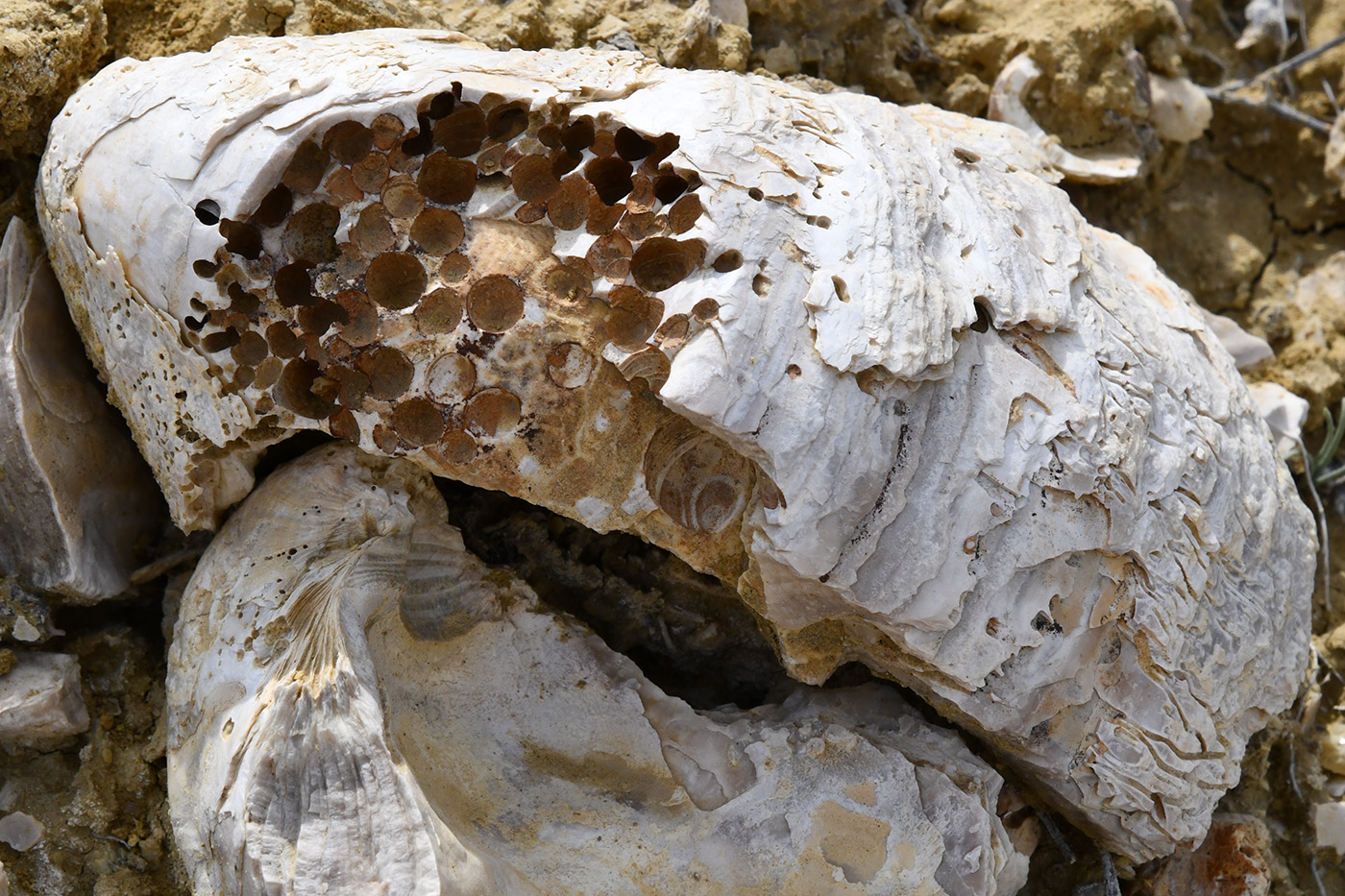 Группа цветущих Melilotoides cretacea на крутом слоистом склоне; видны так же вегетирующие Seseli ponticum и цветущие Reseda lutea, на гребне — одиночные Pinus pityusa с частично обнажившимися корнями. 09.05.2025. [spring]