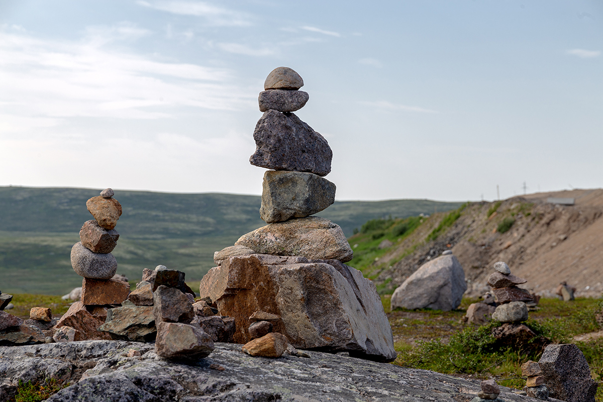 Смотровая точка по дороге в Териберку. На скалистых возвышенностяx — малоснежная каменистая кустарничково-лишайниковая тундра. На склоне на переднем плане — ёрниковая берёзовая лесотундра с деревцами Betula czerepanovii(?). В депрессии — мезотрофные осоково-пушицевые болота. 02.08.2025. [summer]
