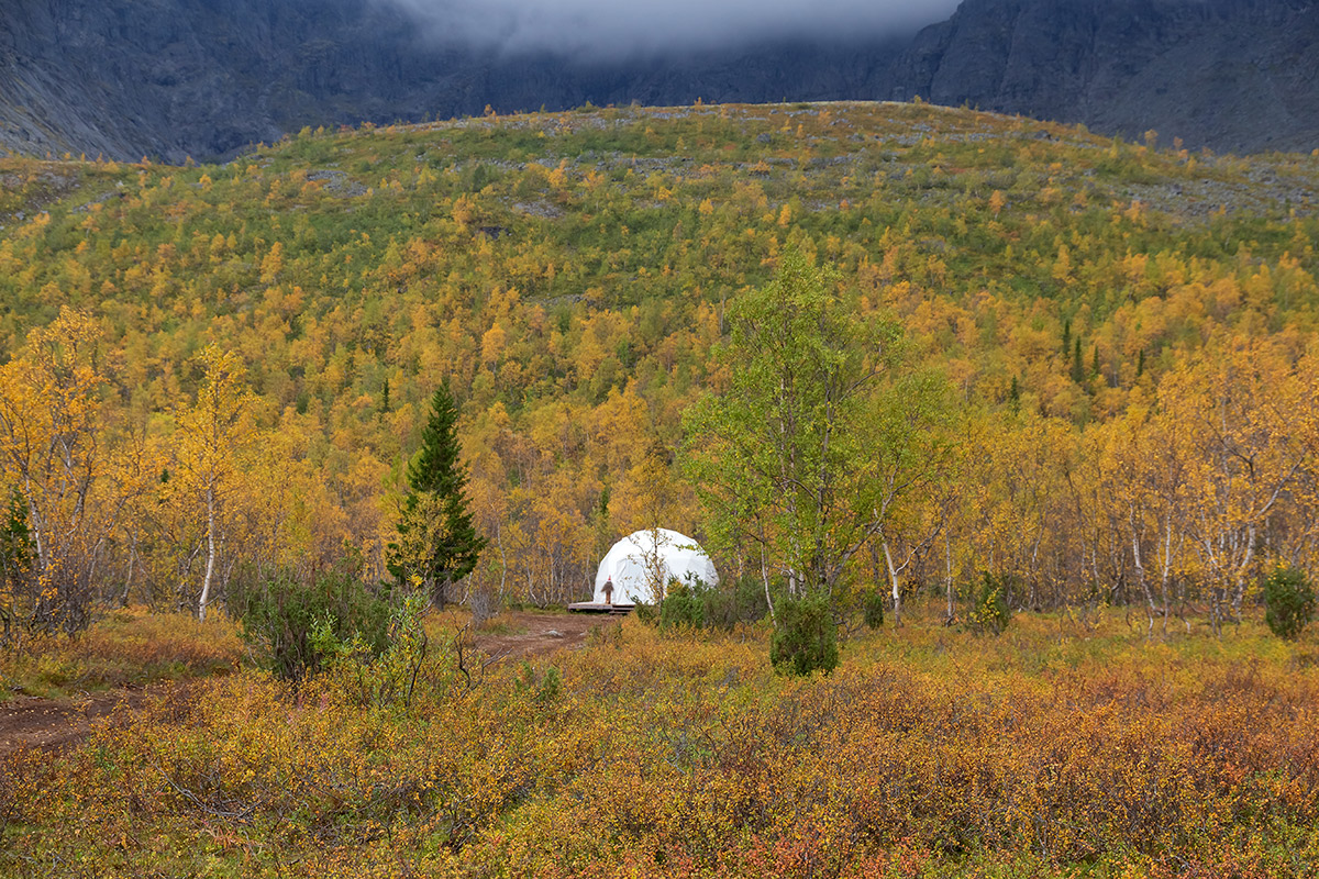 Елово-берёзовый лес в осенней окраске на нижней части склона Вудъяврчорр (?). Справа на горизонте в густых облаках виден перевал Географов. Внизу на переднем плане — заросли Betula nana. 13.09.2025. [autumn]