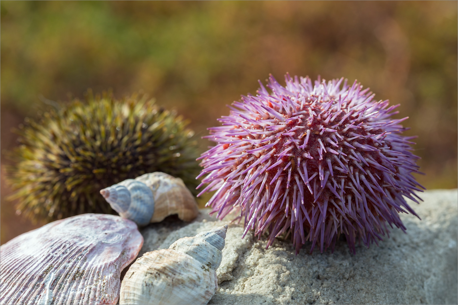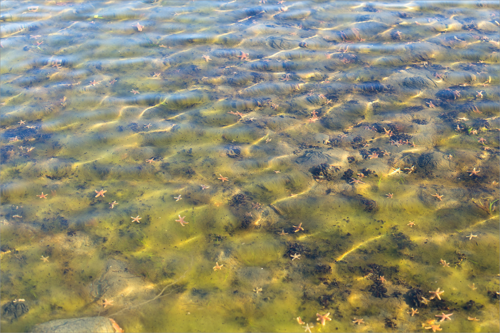 Небольшой мелководный залив, заросший фукусом, во время отлива. В каменистой литоральной зоне аспектирует плодоносящий ситник (Juncus atrofuscus). Берег занят мелколиственно-хвойным лесом с преобладанием берёзы (Betula) и сосны (Pinus sylvestris). 23.07.2025. [summer]