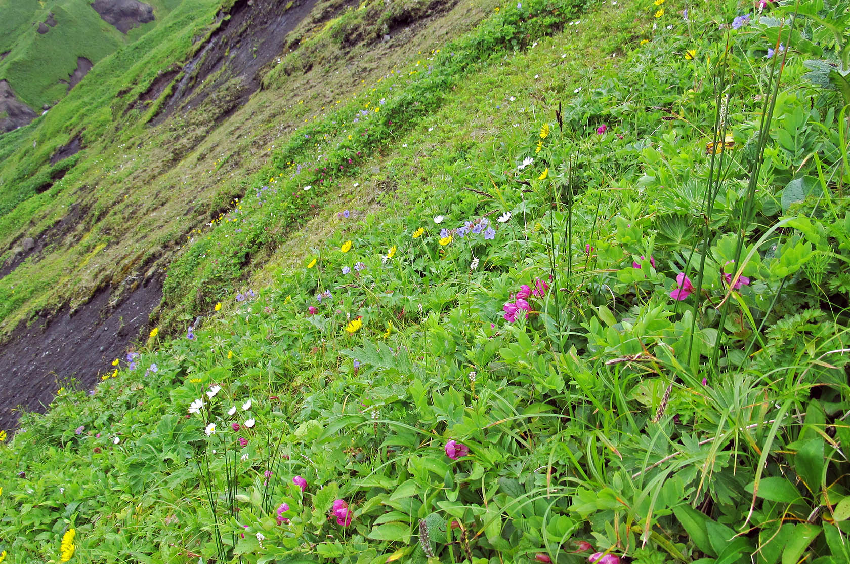 Крутой приморский травяной склон между бух. Корабельная и м. Поповский. Цветут Rhododendron camtschaticum, Arnica unalaschcensis, Geranium erianthum и Arctanthemum arcticum. 29.07.2017. [summer]