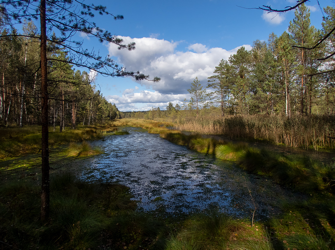Сосново-берёзовый лес и заросли Phragmites вдоль зарастающей Sphagnum и Carex канавы в месте бывших торфоразработок. Окр. пос. Раменский, 1 км к северо-западу от паромной переправы в дер. Мельдино. 19.09.2020. [autumn]