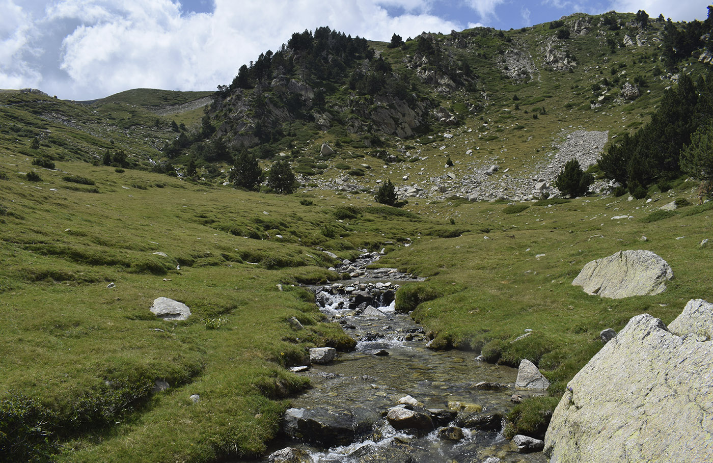 Русло р. Тер, пролегающее по пологому участку в обрамлении луговин, поросших альпийским низкотравьем. Около камней, виднеющихся среди плотных дерновин злаков, можно встретить Silene acaulis, Parnassia palustris, Jasione crispa и др. 27.07.2021. [summer]