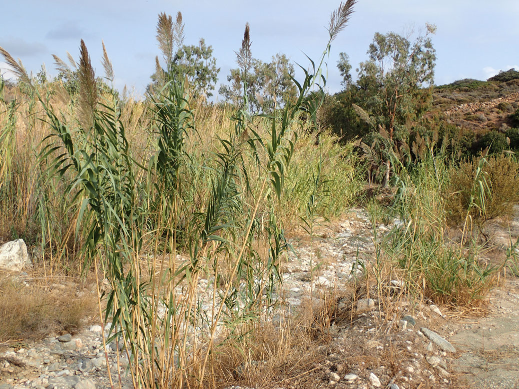 Arundo donax на берегу сезонно пересыхающей реки, на заднем плане — Eucalyptus camaldulensis. Юго-восточное побережье острова, окр. пос. Дриос. 07.10.2017. [autumn]