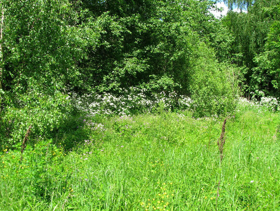 Опушка выходящего к дороге леса с березой по краю; в травяном покрове купырь лесной, герань лесная, щевель курчавый, лютики, злаки. 15.06.2009. [late spring — early summer]