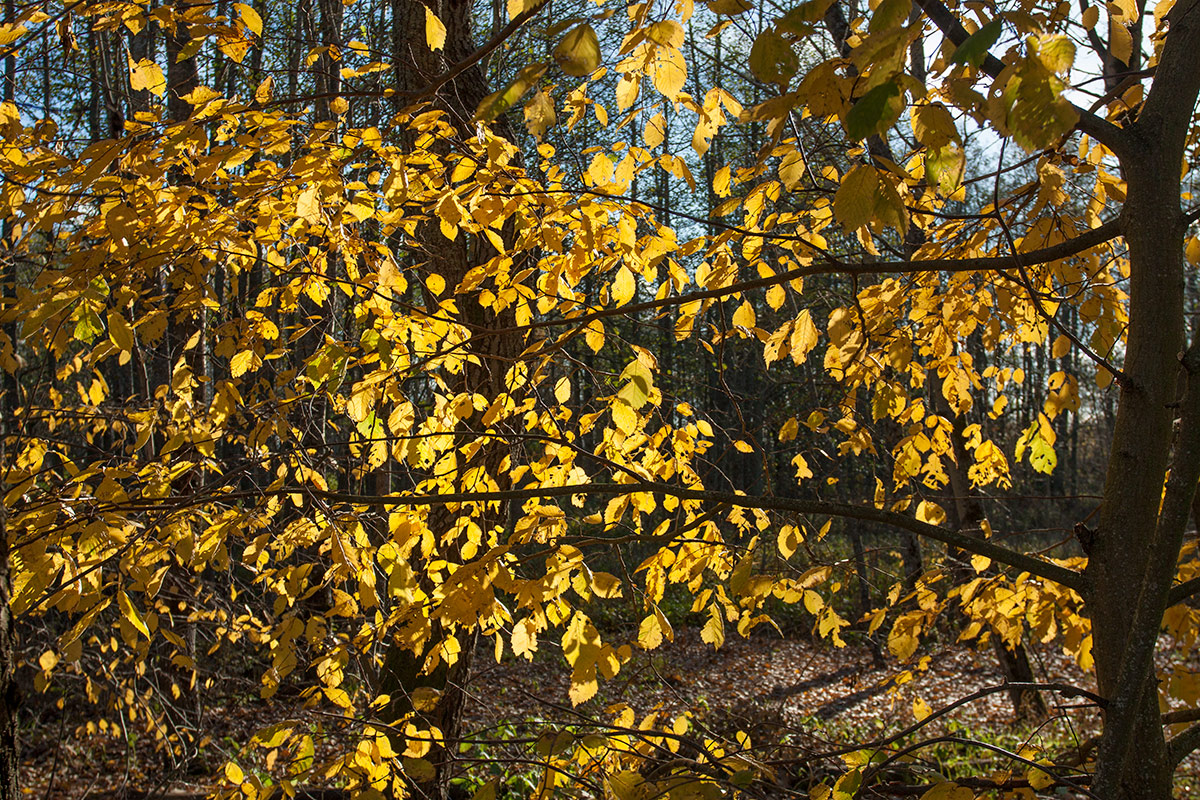 Часть кроны молодого дерева с листвой в осенней окраске. Санкт-Петербург, Кронштадтский р-н; о-в Котлин, северное побережье Финского зал. к западу от форта "Шанец", прибрежный лес с доминированием Alnus glutinosa и Salix. 21.10.2018.