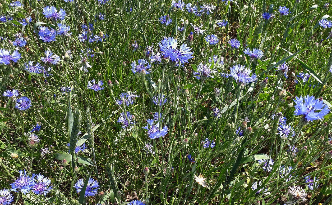 Верхушки цветущих растений и единичные колоски пшеницы. Республика Татарстан, Апастовский р-н, окр. с. Шонгуты, правый берег р. Улема, молодая залежь вдоль трассы. 19.06.2019.