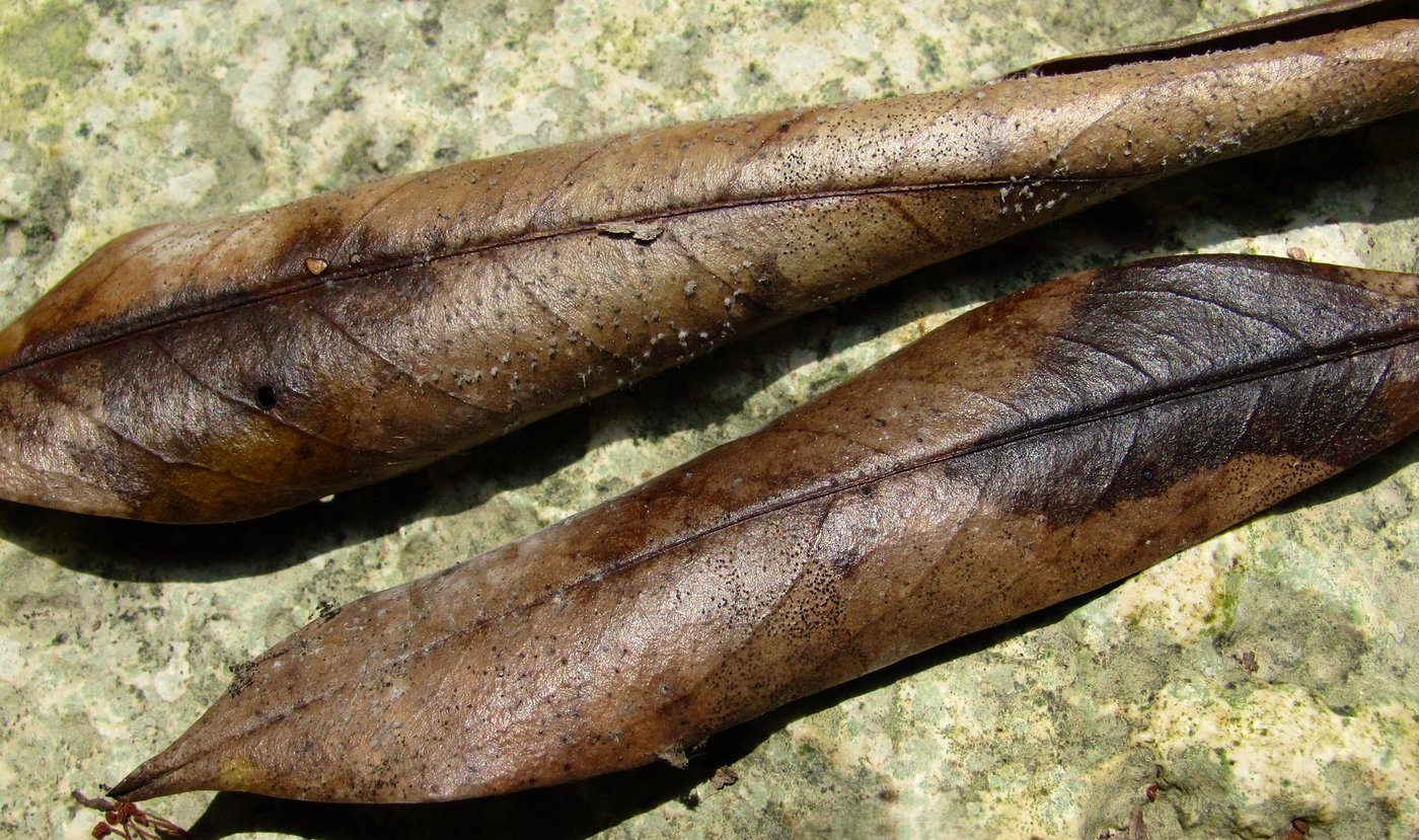 Листья с мёртвой ветви, заселённые микромицетами. Краснодарский край, окр. Сочи, у реки. 05.07.2015.