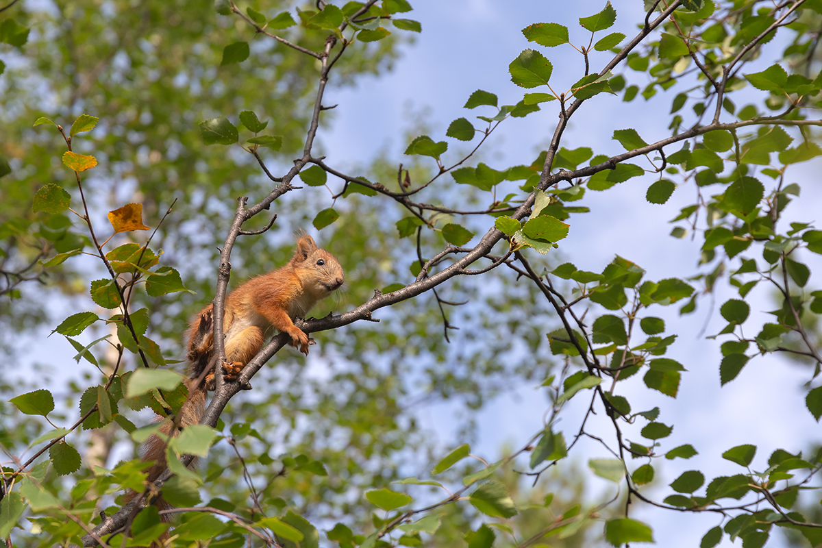 Ветвь дерева с сидящей белкой. Мурманск, Октябрьский р-н, окр. оз. Большое, смешанный лес с доминированием Betula. 18.08.2024.