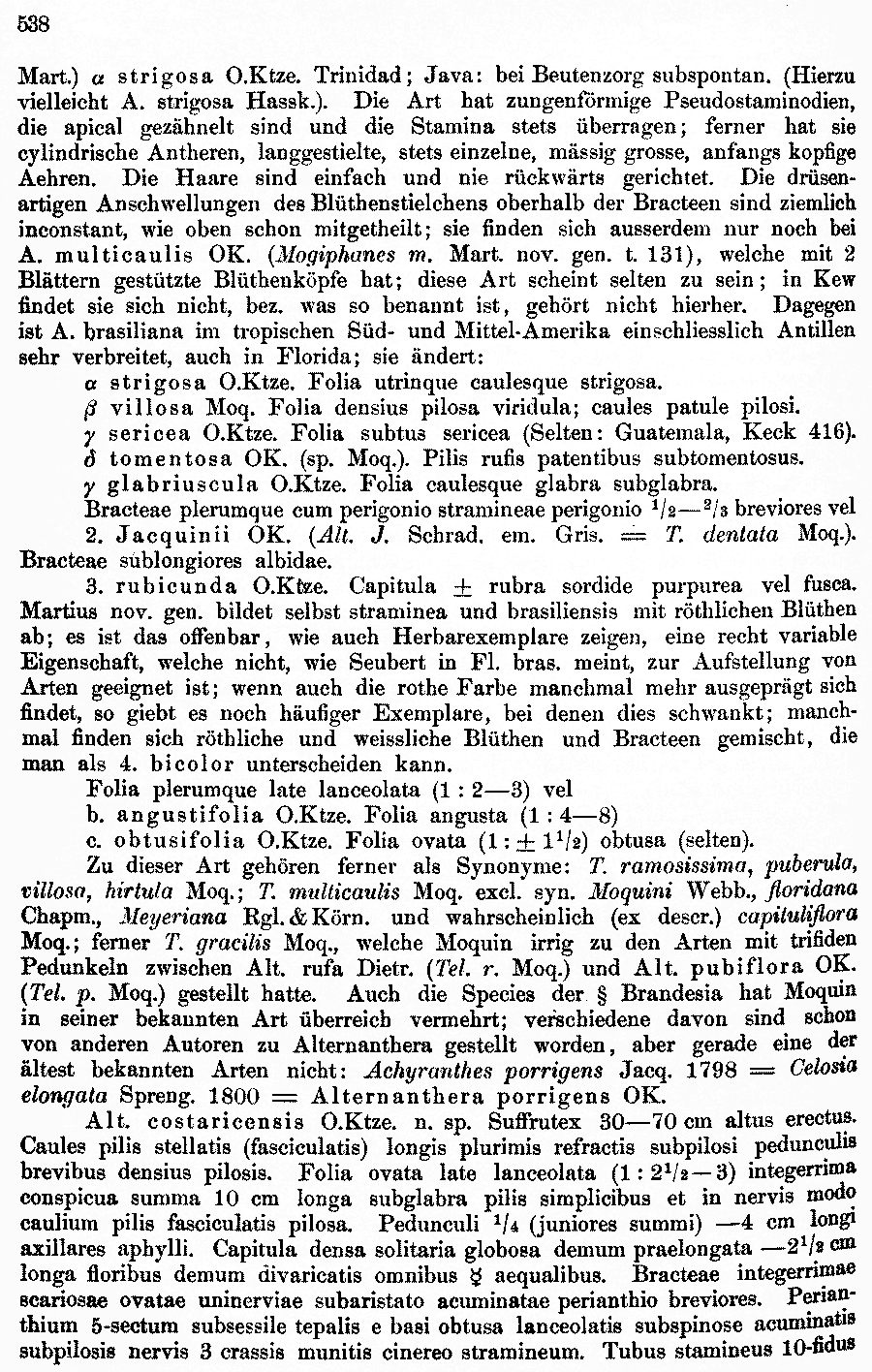 Обнародование комбинаций Achyranthes purpurea Pav. ex Moq., nom. inval. (Prodromus Systematis Naturalis Regni Vegetabilis [A. P. de Candolle] 13(2): 377. 1849), Gomphrena fruticosa Moq., nom. inval. (Prodromus Systematis Naturalis Regni Vegetabilis [A. P. de Candolle] 13(2): 377. 1849), Gomphrena fulgens Moq., nom. inval. (Prodromus Systematis Naturalis Regni Vegetabilis [A. P. de Candolle] 13(2): 377. 1849), Gomphrena purpurea Moq., nom. inval. (Prodromus Systematis Naturalis Regni Vegetabilis [A. P. de Candolle] 13(2): 377. 1849) и Gomphrena trichotoma Moq., nom. inval. (Prodromus Systematis Naturalis Regni Vegetabilis [A. P. de Candolle] 13(2): 377. 1849) и протолог Telanthera gomphrenoides var. ovata Moq. (Prodromus Systematis Naturalis Regni Vegetabilis [A. P. de Candolle] 13(2): 378. 1849) и Telanthera luzuloides Moq. (Prodromus Systematis Naturalis Regni Vegetabilis [A. P. de Candolle] 13(2): 378. 1849):