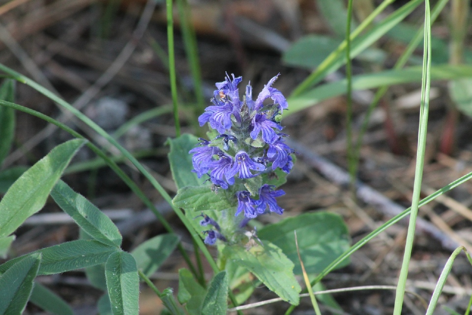 Растение из семейства губоцветных (яснотковых). Листья супротивные пильчатые. Цветки голубые. Снято в лесу на Верхней Террасе 1.06.21 г. Определял на определителе сайта, но определил неправильно, как живучку ползучую. Что за вид на самом деле?