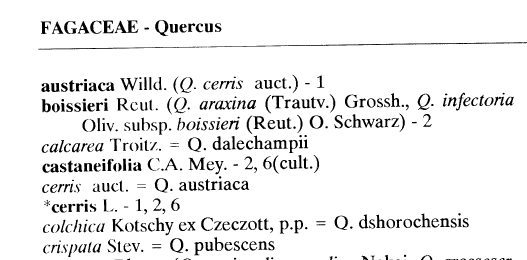 5.Самый ранний известный мне источник, в котором Q. crispata сведен в синонимы Q. pubescens - обработка рода Quercus Малеева для "Флоры СССР". Единственный аргумент Малеева - утверждение, что Q. crispata представляет собой порослевые побеги Q. pubescens. Это утверждение давно опровергнуто А. А. Гроссгеймом во "Флоре Кавказа":