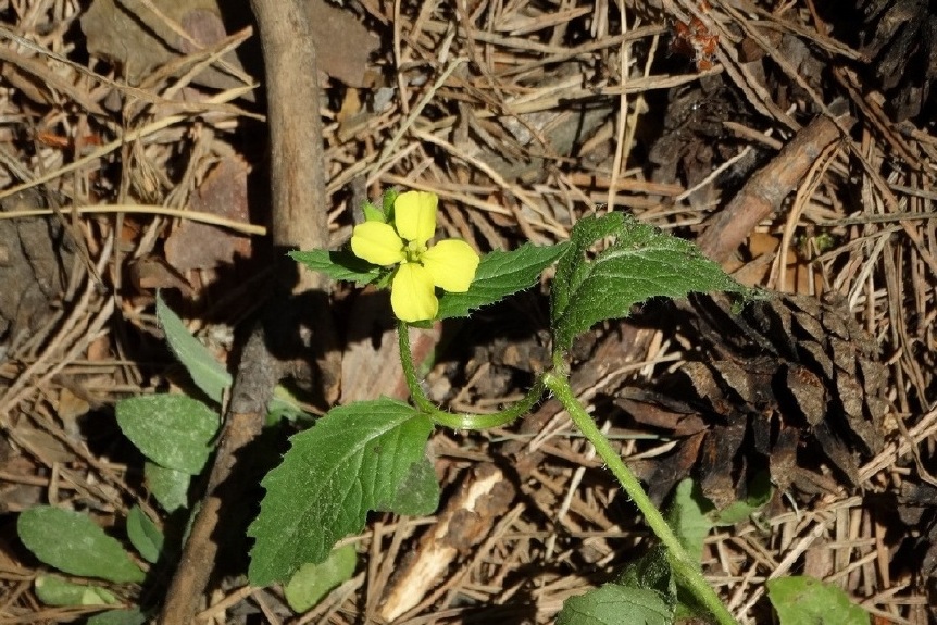 Растение из семейства крестоцветных. Листья очередные, ланцетные, края пильчатые, черешки короткие, ствол опущен. Цветок ярко желтый, диаметром 10 мм. Произрастает в парке, практически на тропе. Снято 15 июня на Верхней Террасе г. Ульяновск.