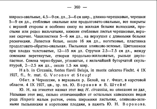 "Ю. Н. на этикетке назвал этот вид Н. circassica, но описания не дал. Называю этот вид, сильно отличающийся от остальных кавказских видов рода Hesperis малым ростом, очень широкими листьями, оливково-зелеными пыльниками и короткими плодами, в память Ю. Н. Воронова."