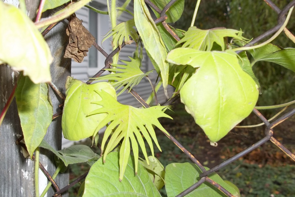 Вместе с фасолью выросло растение из семейства вьюнковых. Предполагаю, что это Ипомея многораздельная, (Ipomoea multifida). Фото сделано 19 октября. Так ли это?
