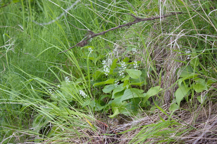 Растёт на крутом берегу, в густой траве. Деревья берёза лиственица.