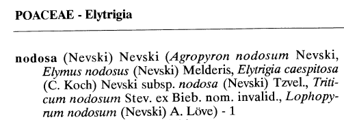 | Dmitry Oreshkin | В Черепанове название "Triticum nodosum Stev. ex Bieb." считается невалидным, поэтому, видимо, и Elytrigia nodosa (Nevski) Nevski, а не Elytrigia nodosa (Steven ex Griseb.) Nevski.