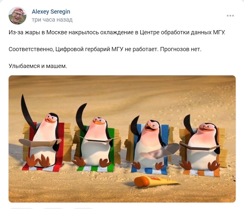 | Гавриил Меламуд | Коллеги, у вас сейчас работает сайт цифрового гербария МГУ? У меня он уже пару часов не грузится. |