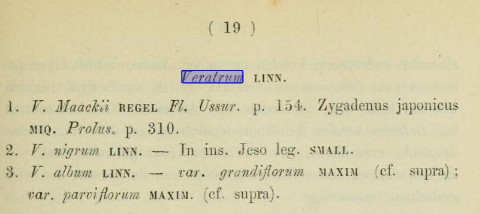 Авторство должно быть как в POWO (Maxim. ex Miq.) O.Loes. Так как Джон Гилберт Бейкер привел Veratrum album var. grandiflorum Maxim. в Journal of the Linnean Society, Botany 17: 471. 1879. Но ранее в Verslagen Meded. Afd. Natuurk. Kon. Akad. Wetensch., ser. 2, 4: 17 (1869) это сделал Фридрих Антон Вильгельм Микель.