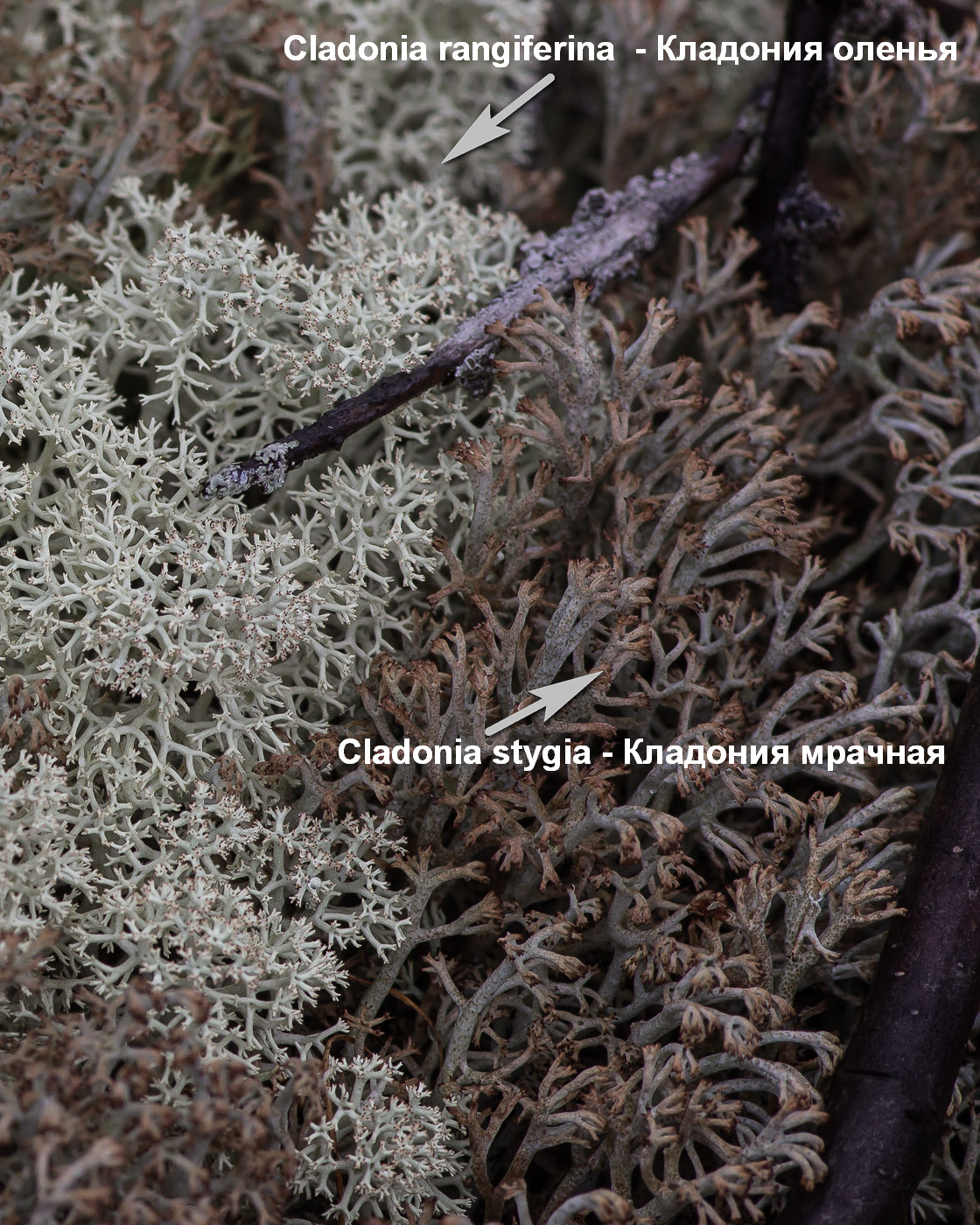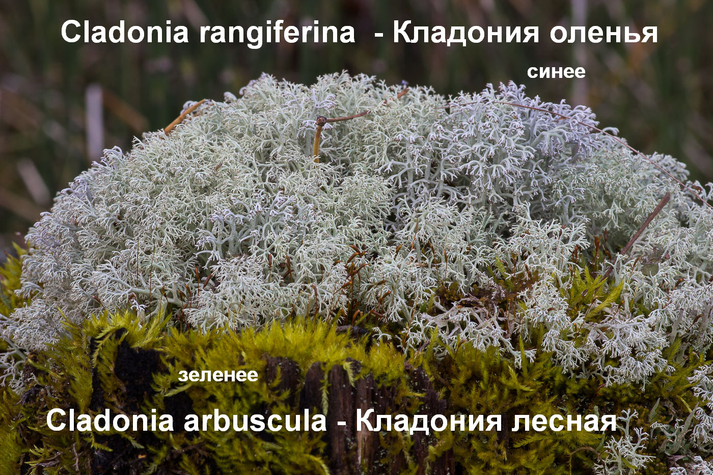Насчёт большей гигрофильности Cladonia rangiferina — не замечал. |