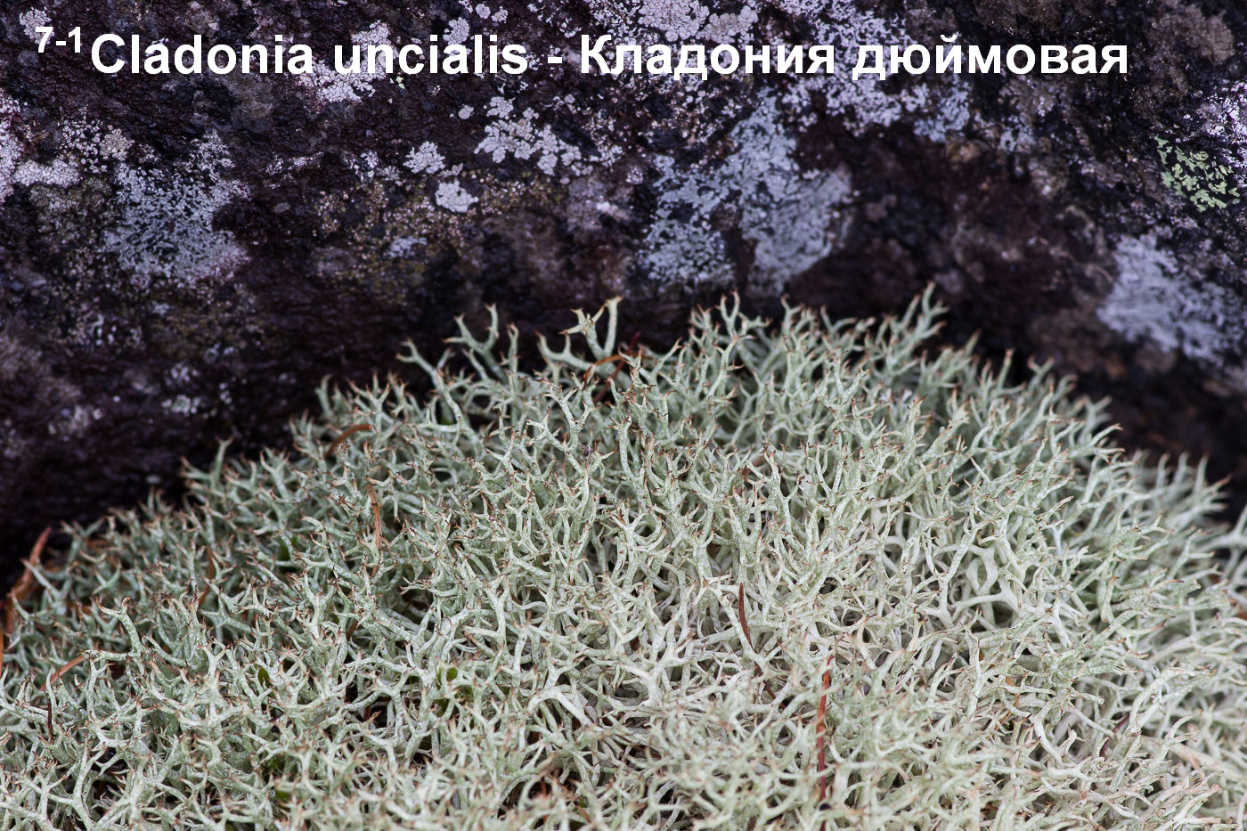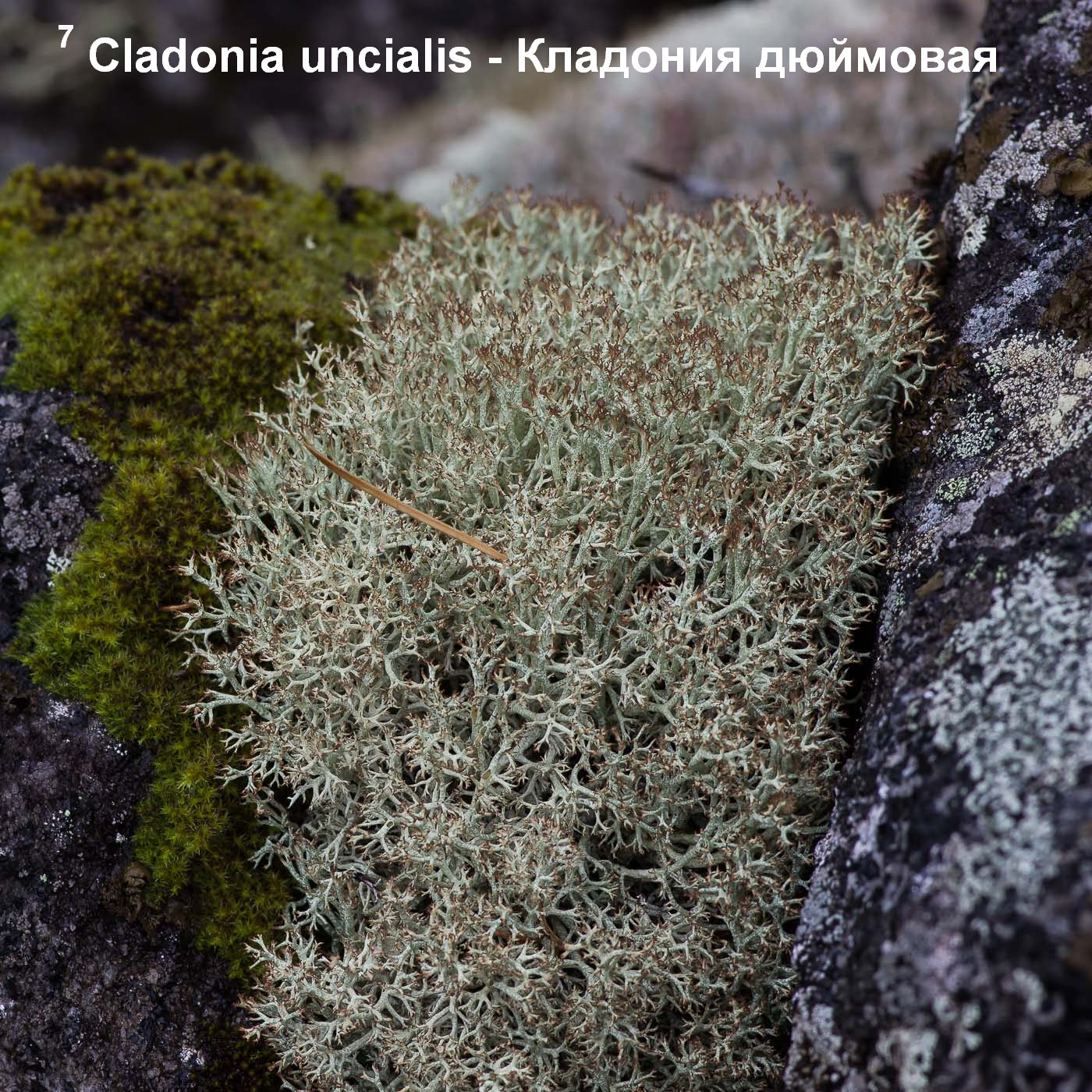 тут я подозреваю Cladonia uncialis — у неё обычно больше жёлтого оттенка, веточки с дырочками в местах ветвления, обычно довольно ровные округлые куртинки. В местах, где я бывал, встречается изредка вкраплениями среди кладоний других видов ( Cladonia arbuscula, Cladonia rangiferina). |
