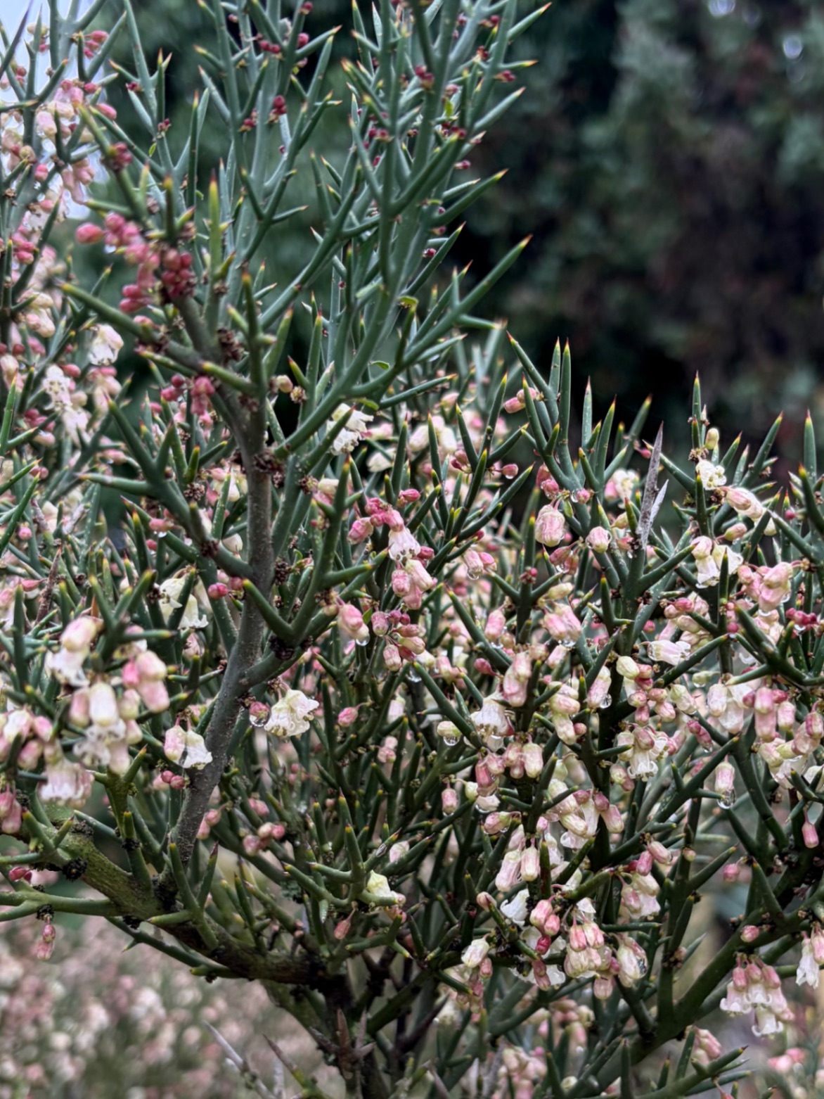 иголки похожи на кеберлинию колючую, но это невысокое дерево, со старым стволом. чем-то похоже на эрику древовидную. безумно понравилось, красивое и вкусно пахнущее