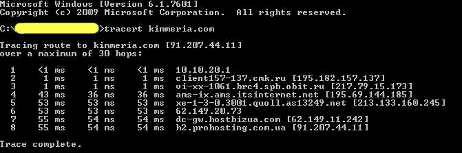 - В открывшемся окне консоли вводим tracert и через пробел - имя интересующего нас домена (без "http" и "www")
