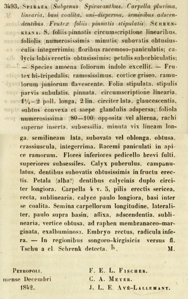 | Aleksandr Ebel | Дело не совсем ясное. В цитате во "Флоре СССР" (т. 9, с. 316) написано, что название Фишера и Мейера (т.е. - Spiraea schrenkiana) - это nomen nudum. Если это действительно так (к сожалению, Index Seminum в нашей библиотеке нет), то следует считать, что именно К.И. Максимович впервые действительно обнародовал это название, но в составе описанного им же р. Spiraeanthus и с указанным выше написанием эпитета (через -ck-). |